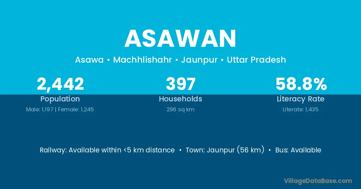 The literacy rate of Asawan village is 46.70%. Male literacy stands at 55.27% and female literacy at 37.71%.