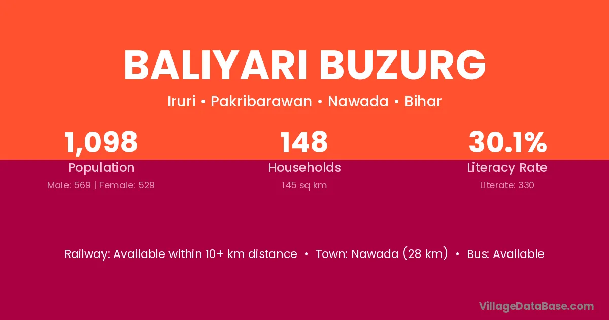 Nawada (28 km) is the nearest town to Baliyari Buzurg village for major economic activities and is located approximately 28 km away.