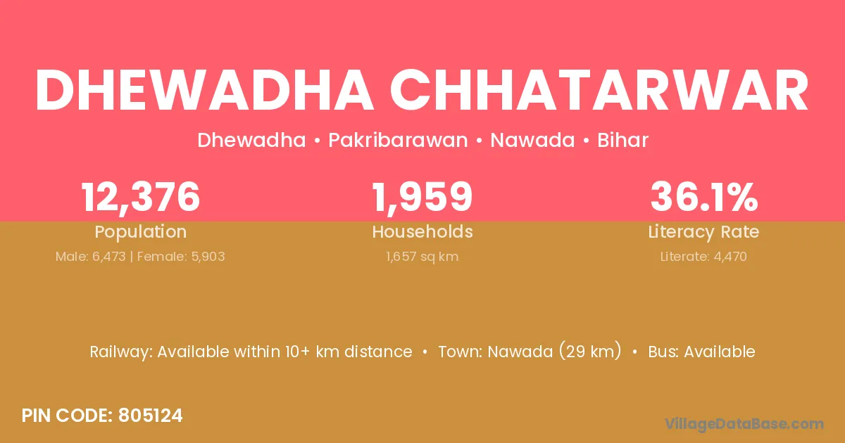 Nawada (29 km) is the nearest town to Dhewadha Chhatarwar village for major economic activities and is located approximately 29 km away.