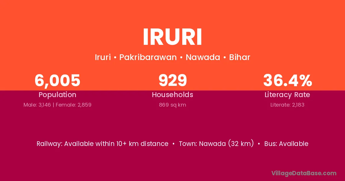 Nawada (32 km) is the nearest town to Iruri village for major economic activities and is located approximately 32 km away.