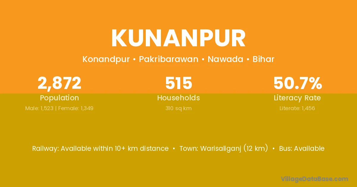 Warisaliganj (12 km) is the nearest town to Kunanpur village for major economic activities and is located approximately 12 km away.