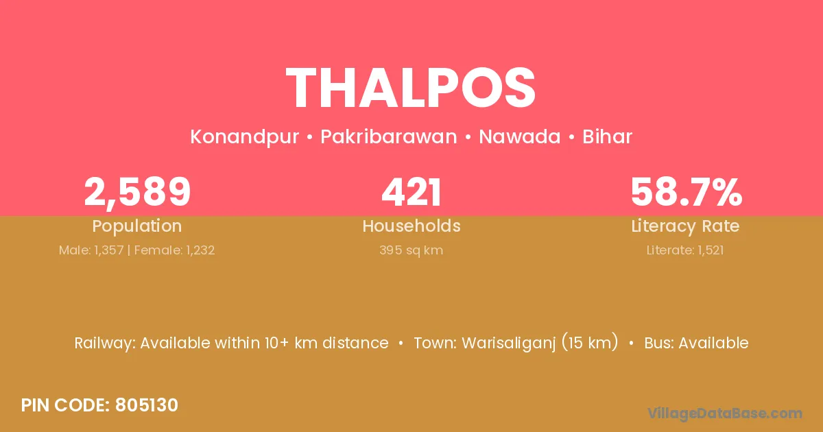 Warisaliganj (15 km) is the nearest town to Thalpos village for major economic activities and is located approximately 15 km away.