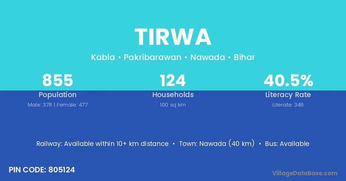 Nawada (40 km) is the nearest town to Tirwa village for major economic activities and is located approximately 40 km away.