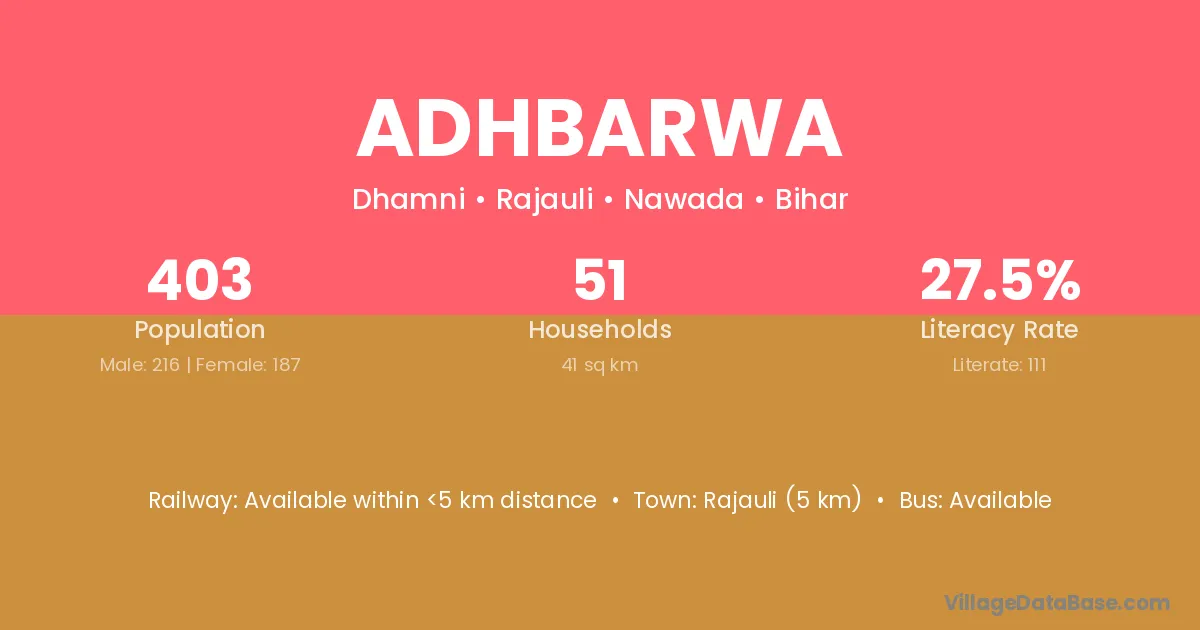Rajauli (5 km) is the nearest town to Adhbarwa village for major economic activities and is located approximately 5 km away.