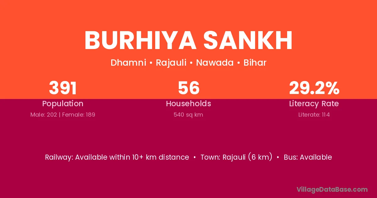 Rajauli (6 km) is the nearest town to Burhiya Sankh village for major economic activities and is located approximately 6 km away.