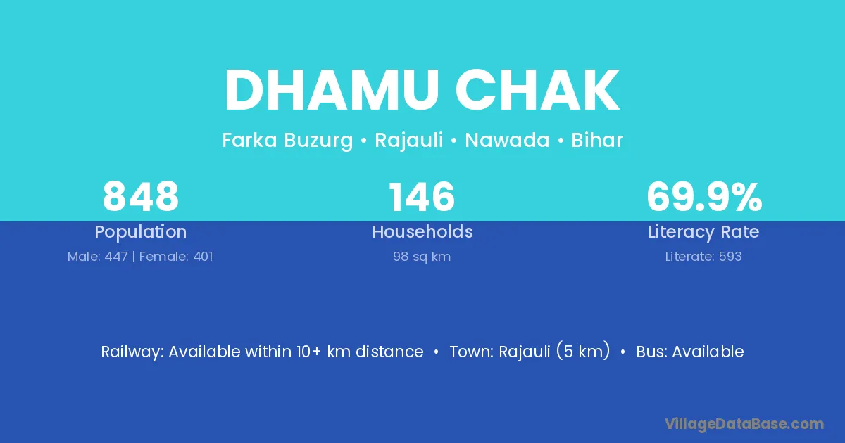 Rajauli (5 km) is the nearest town to Dhamu Chak village for major economic activities and is located approximately 5 km away.