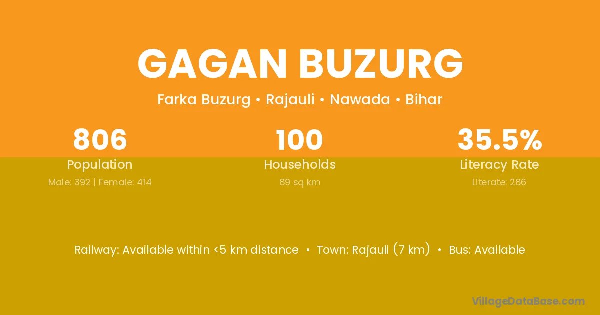 Rajauli (7 km) is the nearest town to Gagan Buzurg village for major economic activities and is located approximately 7 km away.