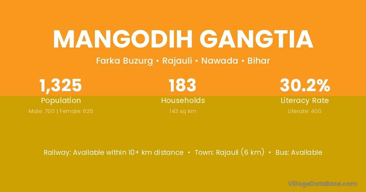 Rajauli (6 km) is the nearest town to Mangodih Gangtia village for major economic activities and is located approximately 6 km away.