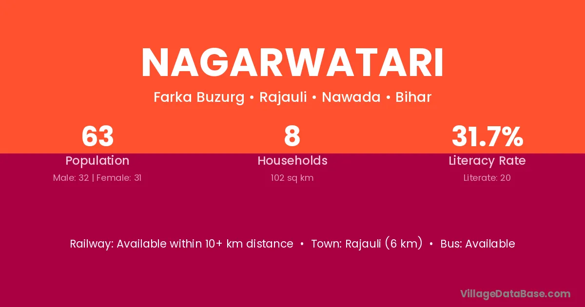 Nagarwatari village has a total population of 63 people, of which 32 are males and 31 are females.