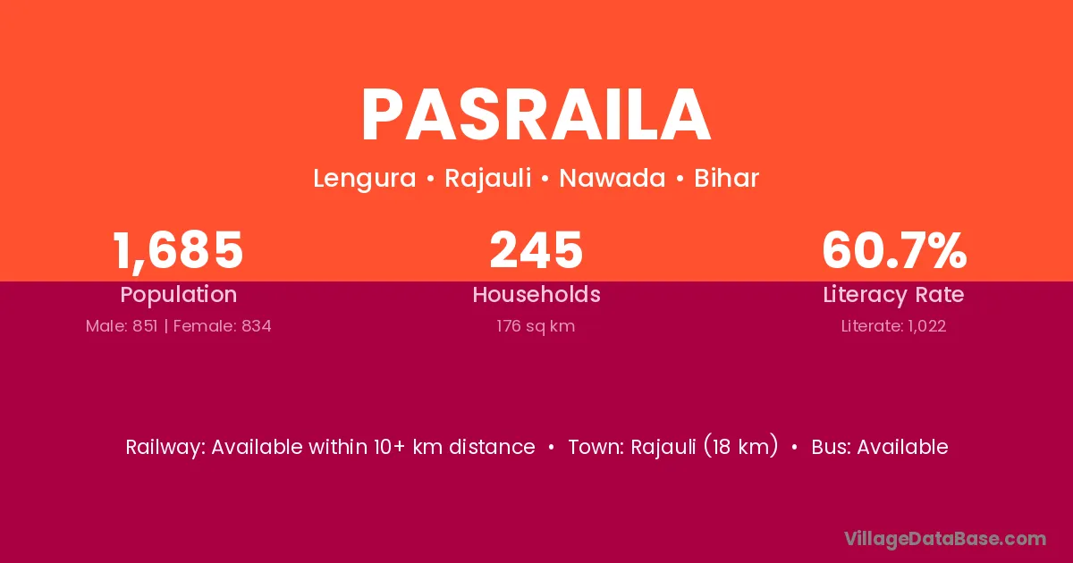 Rajauli (18 km) is the nearest town to Pasraila village for major economic activities and is located approximately 18 km away.