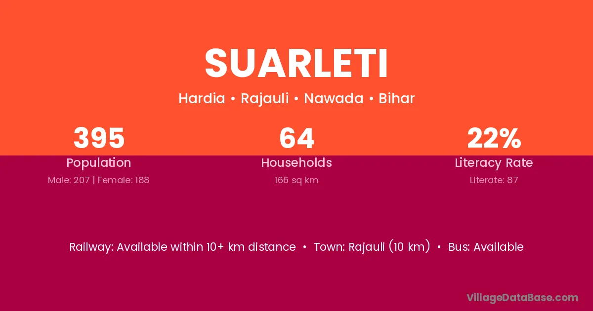 Rajauli (10 km) is the nearest town to Suarleti village for major economic activities and is located approximately 10 km away.