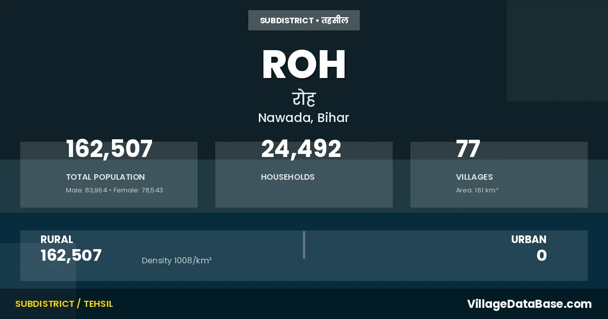 Roh is a town and Subdivision in the Nawada district of the Bihar. In India, a Subdivision is a subdivision of a district responsible for the administration and revenue collection of a specific area within the district. Subdivisions play a crucial role in the local governance structure, contributing significantly to the development and administration of their communities.