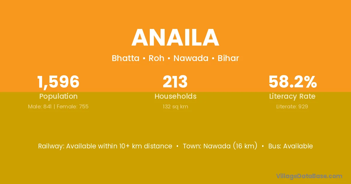 Nawada (16 km) is the nearest town to Anaila village for major economic activities and is located approximately 16 km away.