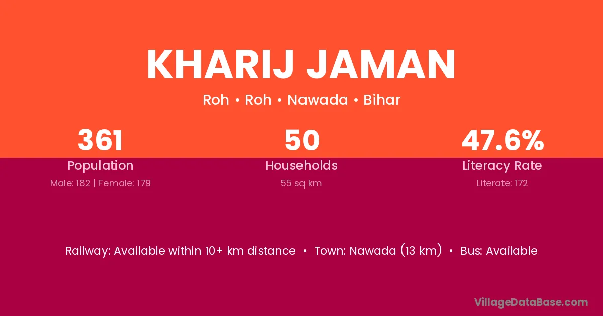 Nawada (13 km) is the nearest town to Kharij Jaman village for major economic activities and is located approximately 13 km away.