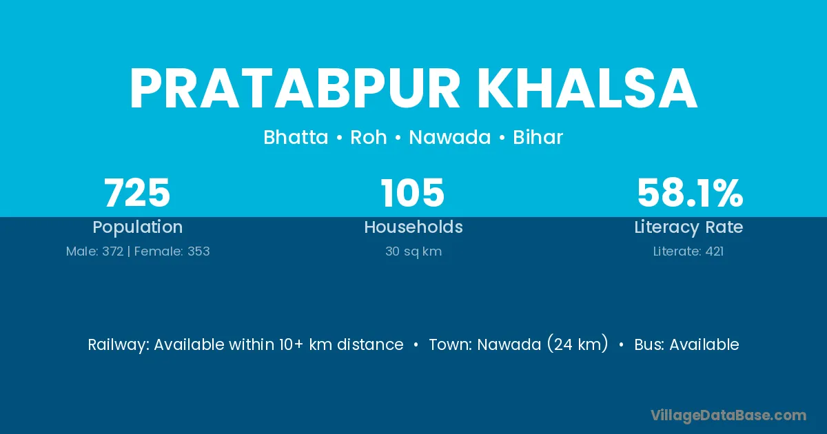Nawada (24 km) is the nearest town to Pratabpur Khalsa village for major economic activities and is located approximately 24 km away.