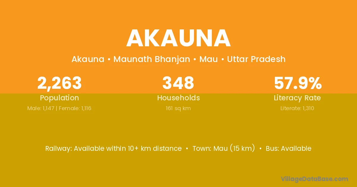 The literacy rate of Akauna village is 51.54%. Male literacy stands at 66.82% and female literacy at 34.89%.