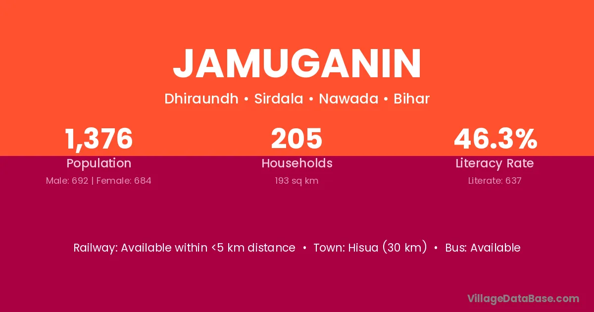 Hisua (30 km) is the nearest town to Jamuganin village for major economic activities and is located approximately 30 km away.