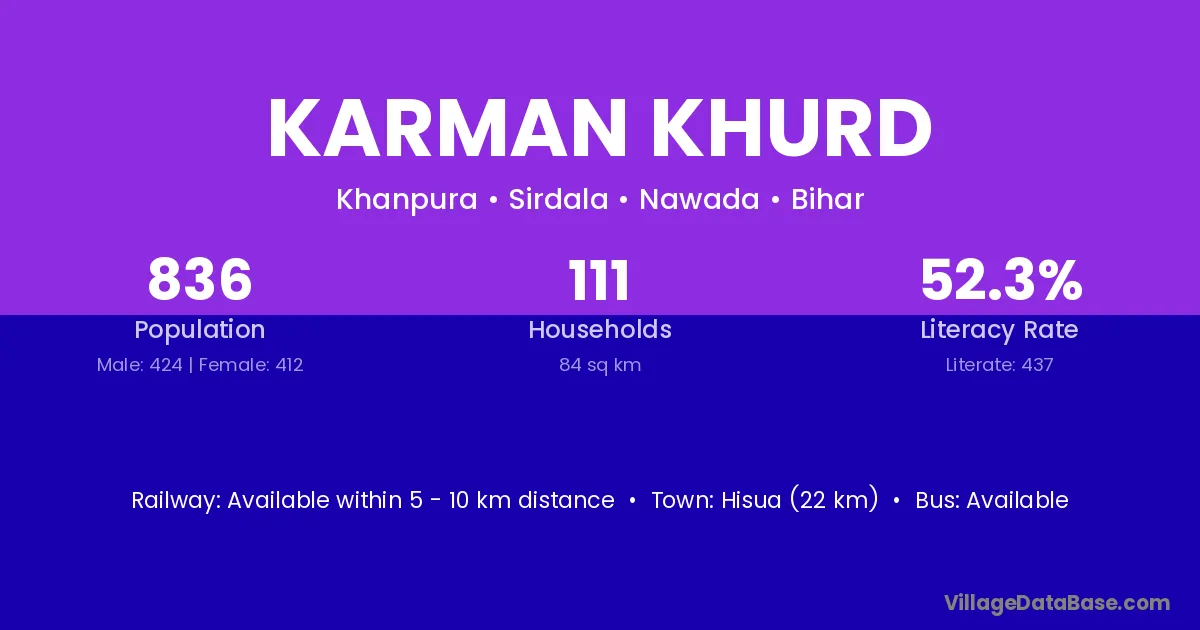 Hisua (22 km) is the nearest town to Karman Khurd village for major economic activities and is located approximately 22 km away.