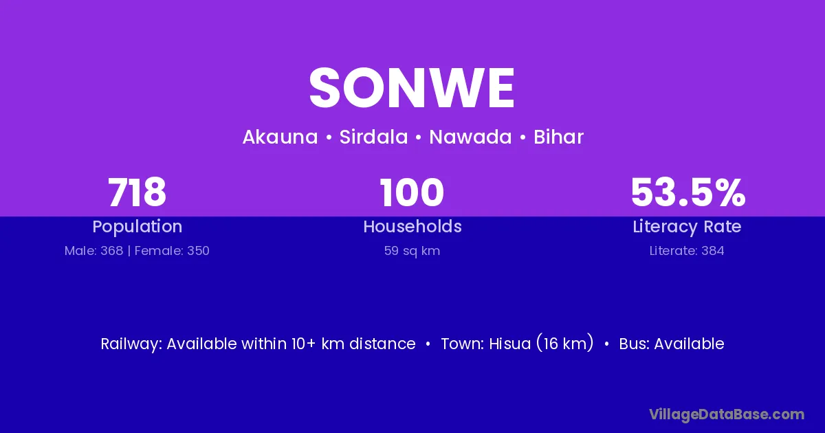 Hisua (16 km) is the nearest town to Sonwe village for major economic activities and is located approximately 16 km away.