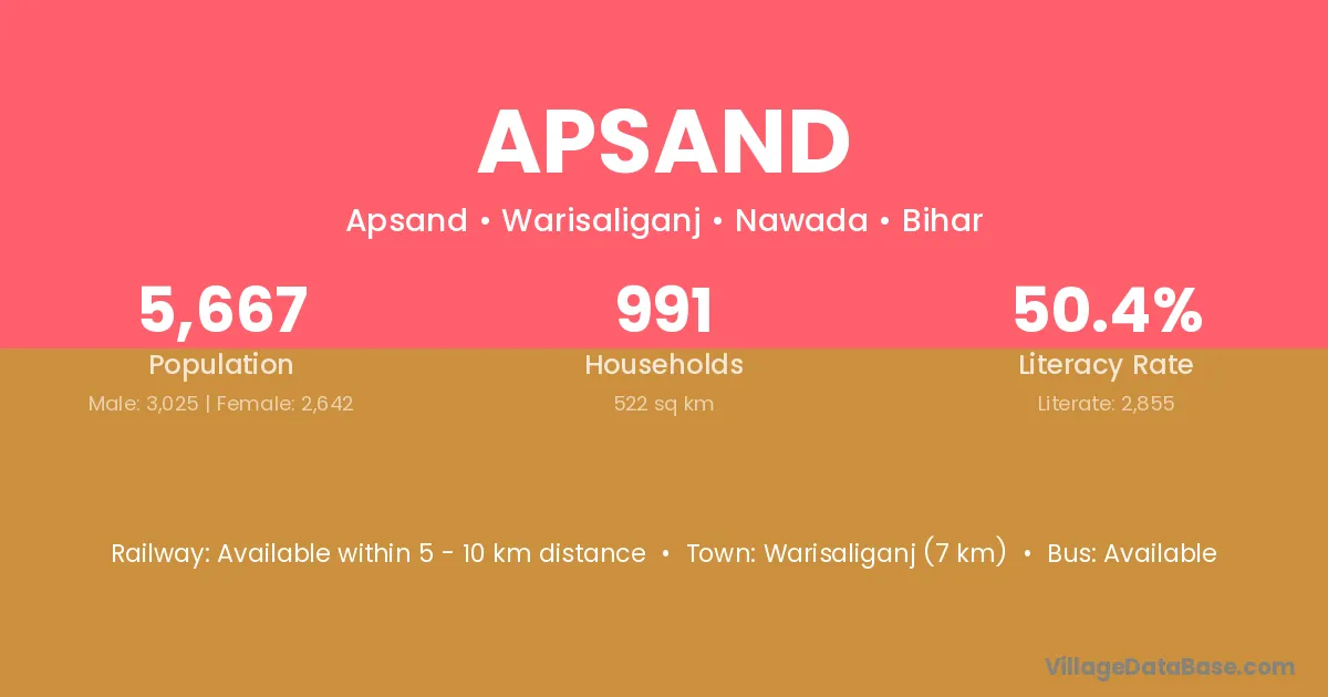 Warisaliganj (7 km) is the nearest town to Apsand village for major economic activities and is located approximately 7 km away.