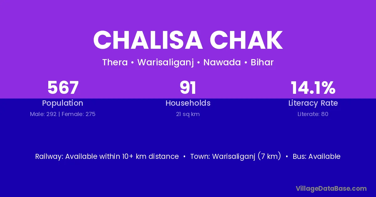Warisaliganj (7 km) is the nearest town to Chalisa Chak village for major economic activities and is located approximately 7 km away.