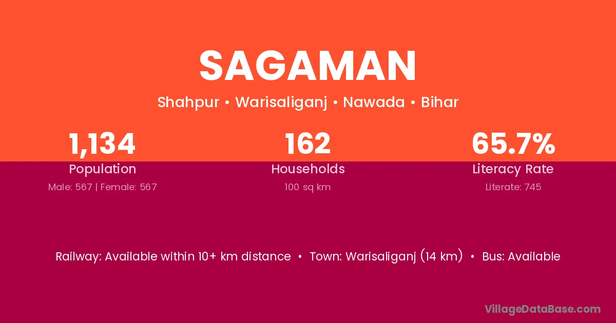 Sagaman village has a total population of 1,134 people, of which 567 are males and 567 are females.