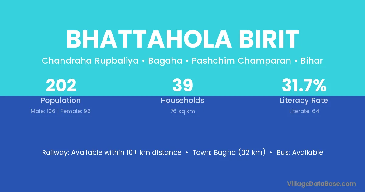 Bagha (32 km) is the nearest town to Bhattahola Birit village for major economic activities and is located approximately 32 km away.