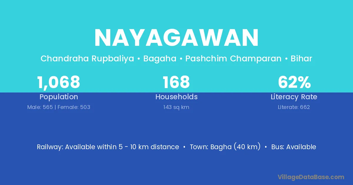 Bagha (40 km) is the nearest town to Nayagawan village for major economic activities and is located approximately 40 km away.