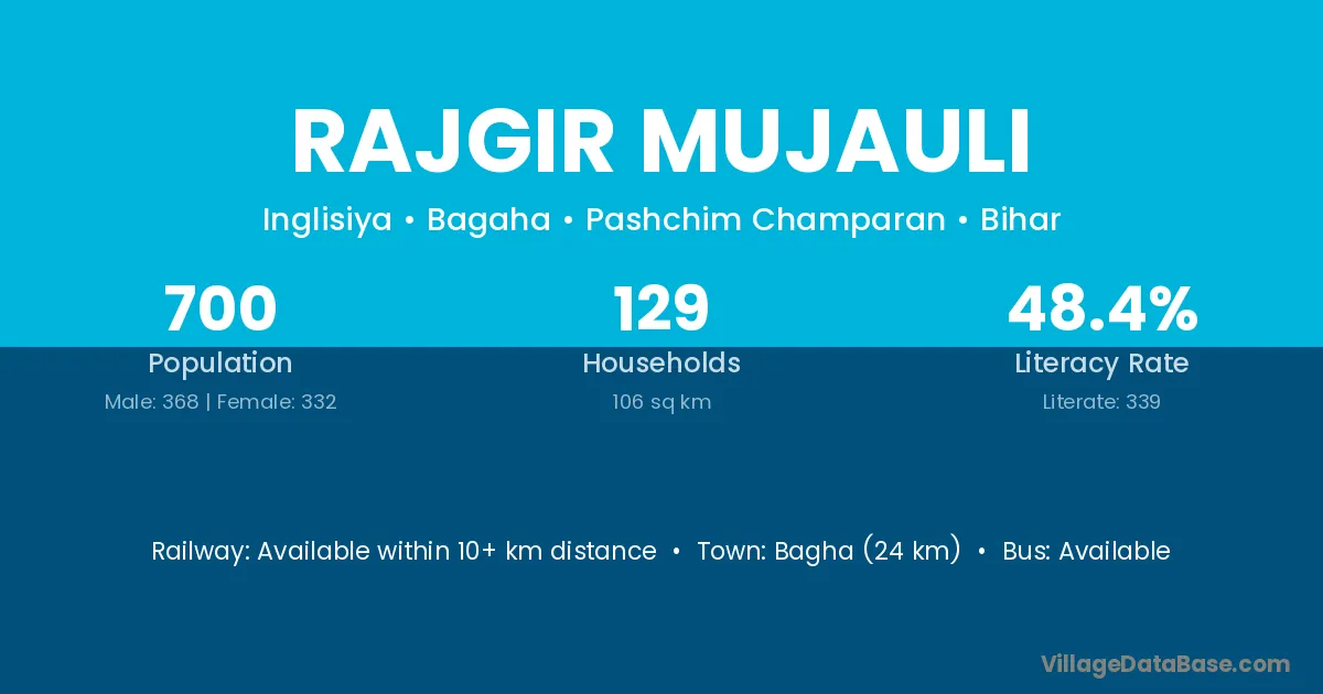 Bagha (24 km) is the nearest town to Rajgir Mujauli village for major economic activities and is located approximately 24 km away.