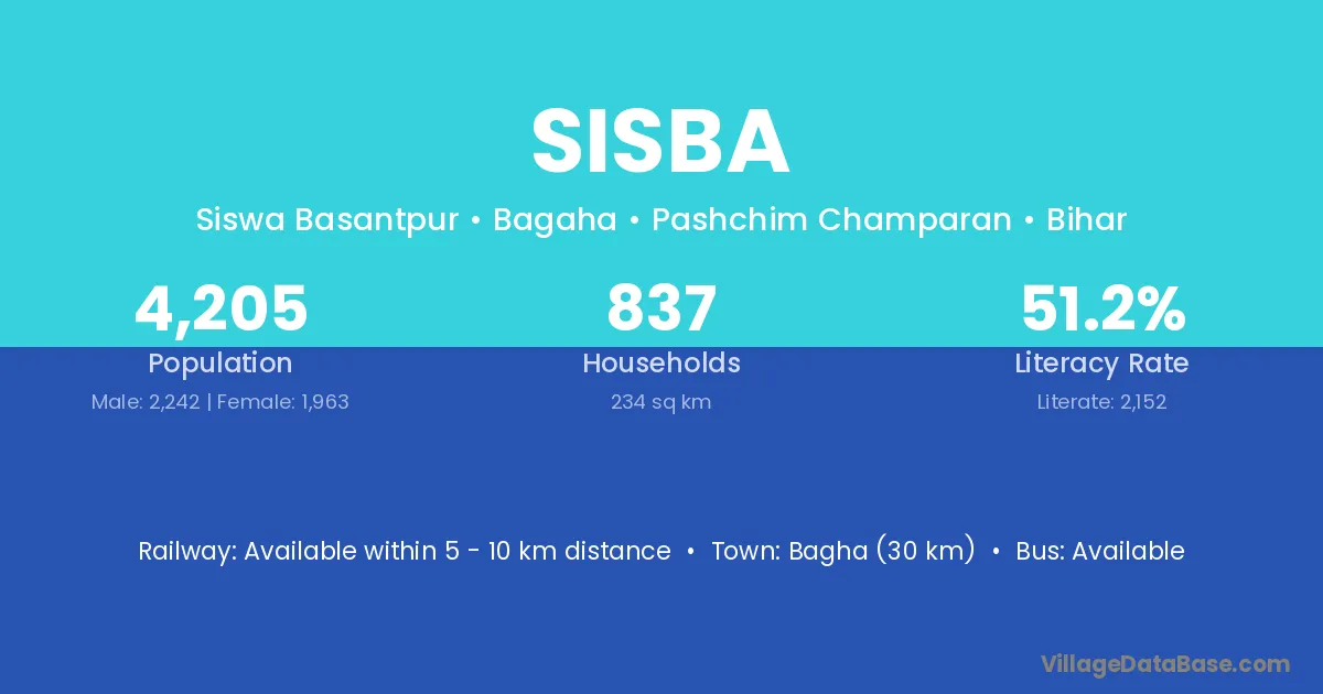 Bagha (30 km) is the nearest town to Sisba village for major economic activities and is located approximately 30 km away.