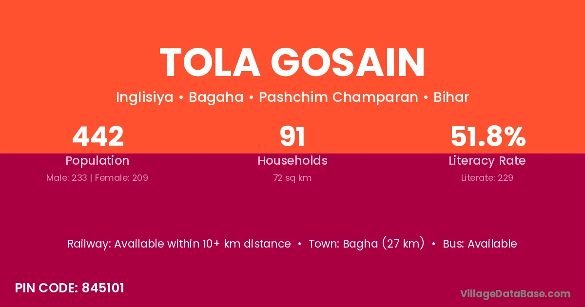 Tola Gosain village has a total population of 442 people, of which 233 are males and 209 are females.
