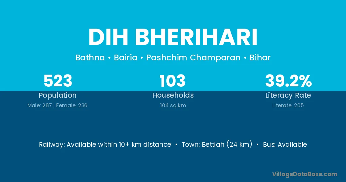 Bettiah (24 km) is the nearest town to Dih Bherihari village for major economic activities and is located approximately 24 km away.