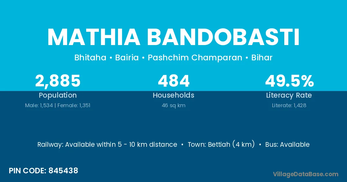 Bettiah (4 km) is the nearest town to Mathia Bandobasti village for major economic activities and is located approximately 4 km away.