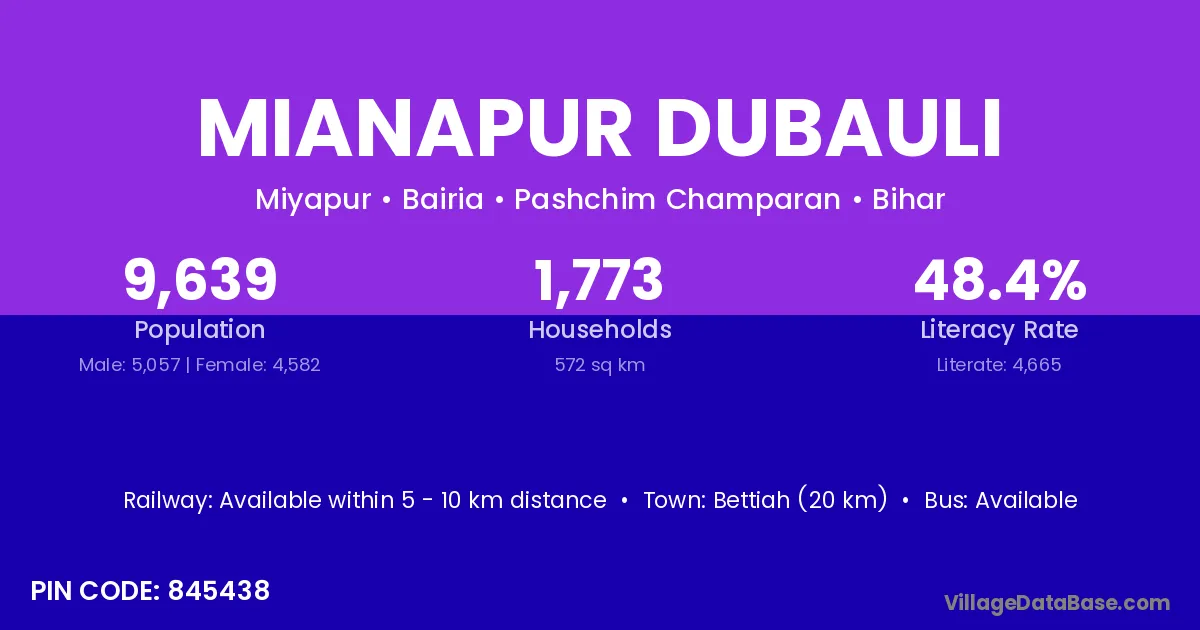 Mianapur Dubauli village has a total population of 9,639 people, of which 5,057 are males and 4,582 are females.