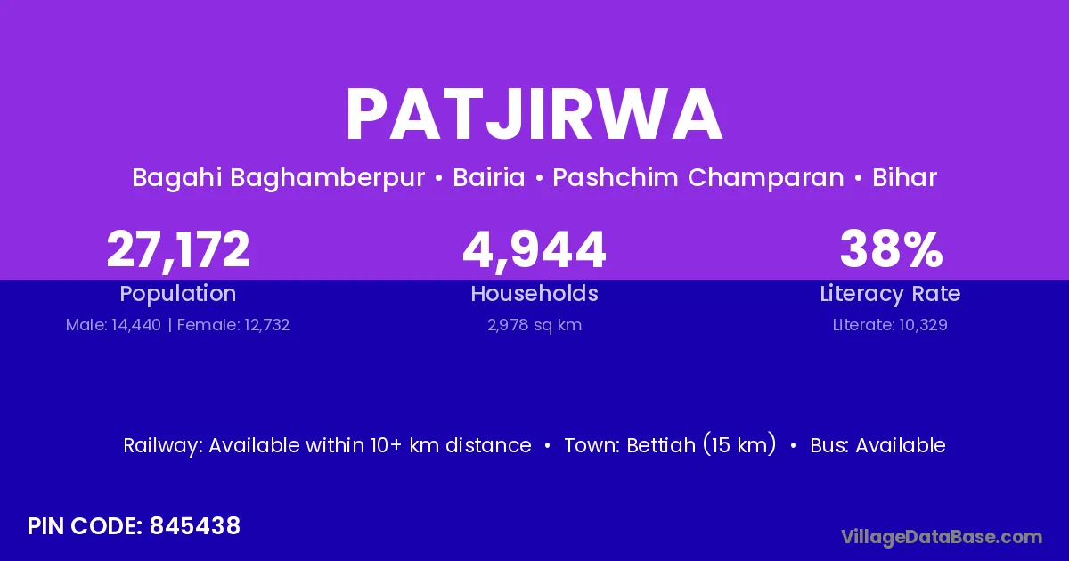 Bettiah (15 km) is the nearest town to Patjirwa village for major economic activities and is located approximately 15 km away.