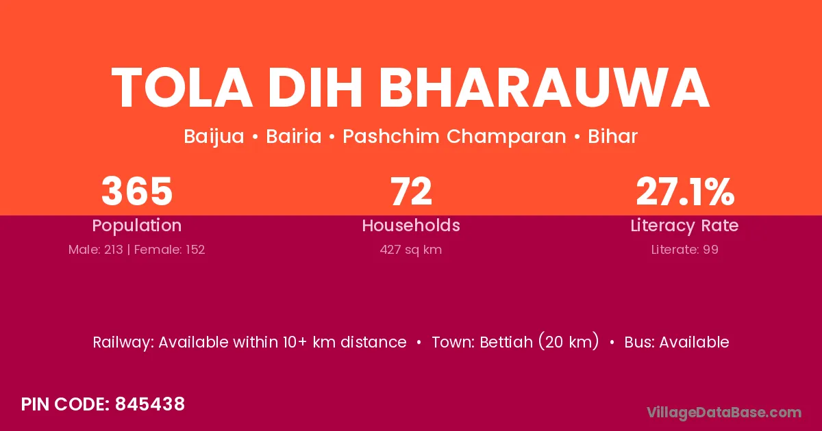 Bettiah (20 km) is the nearest town to Tola Dih Bharauwa village for major economic activities and is located approximately 20 km away.