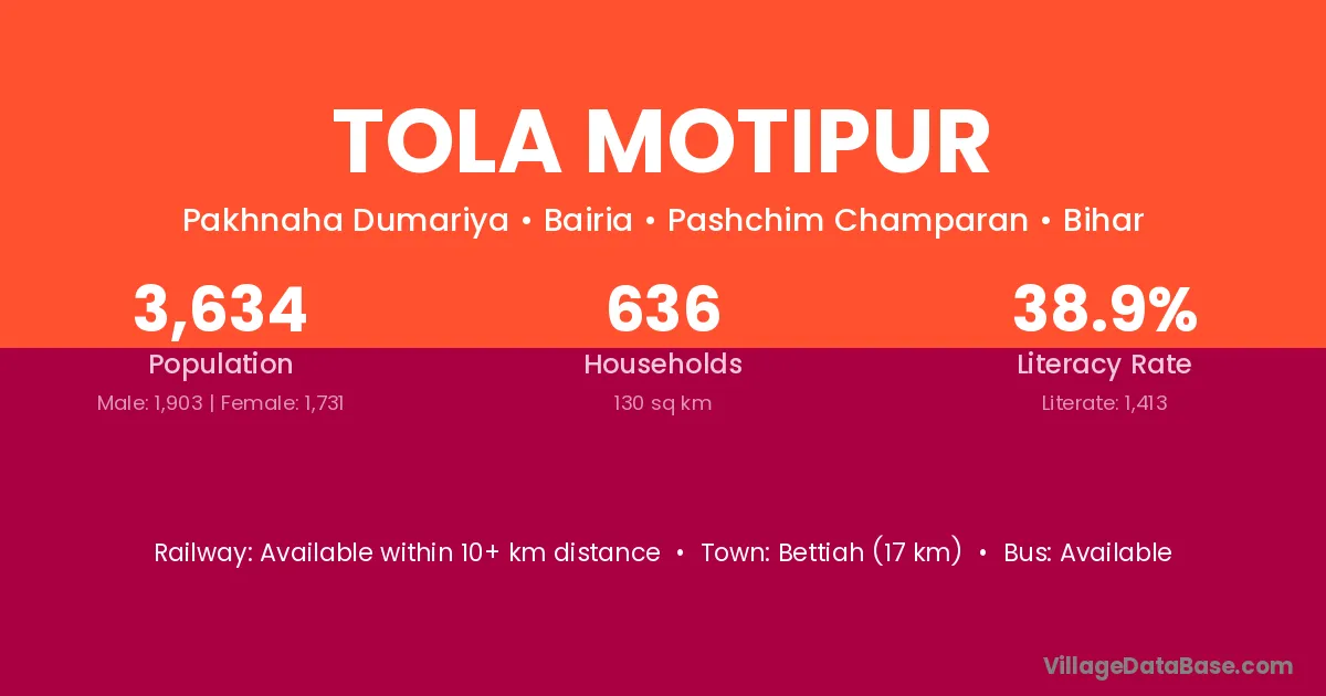 Tola Motipur village has a total population of 3,634 people, of which 1,903 are males and 1,731 are females.