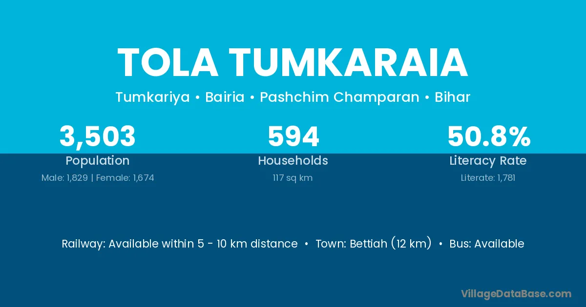 Bettiah (12 km) is the nearest town to Tola Tumkaraia village for major economic activities and is located approximately 12 km away.