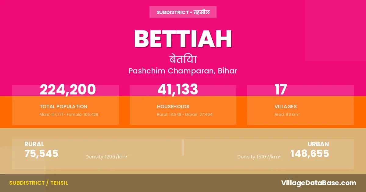 According to the 2011 census The total area of Bettiah Subdivision is 68 km², with a population of 224200 people. The population density is 3,291 inhabitants per square kilometre, and there are approximately 41133 houses in the sub district.
