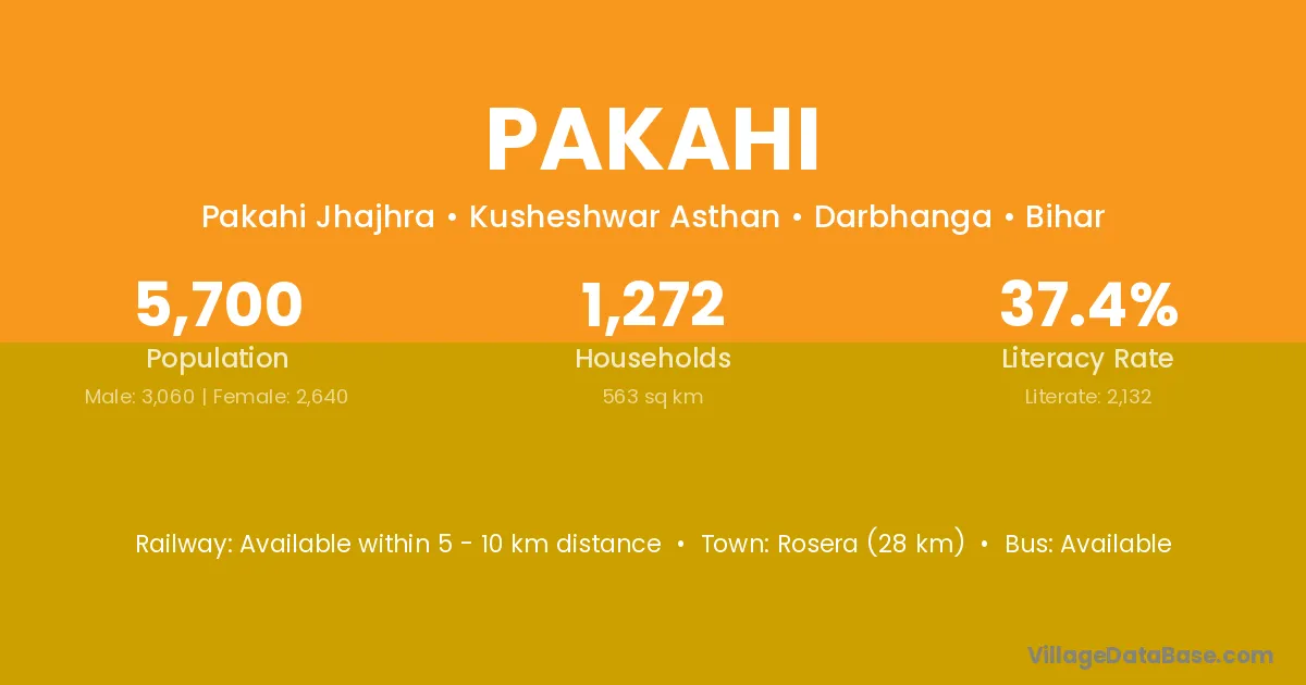 The literacy rate of Pakahi village is 39.47%. Male literacy stands at 47.92% and female literacy at 25.00%.