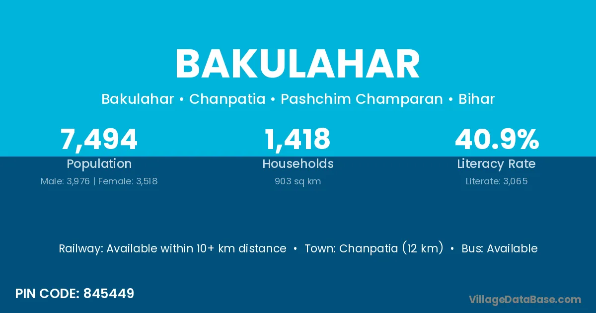 Chanpatia (12 km) is the nearest town to Bakulahar village for major economic activities and is located approximately 12 km away.