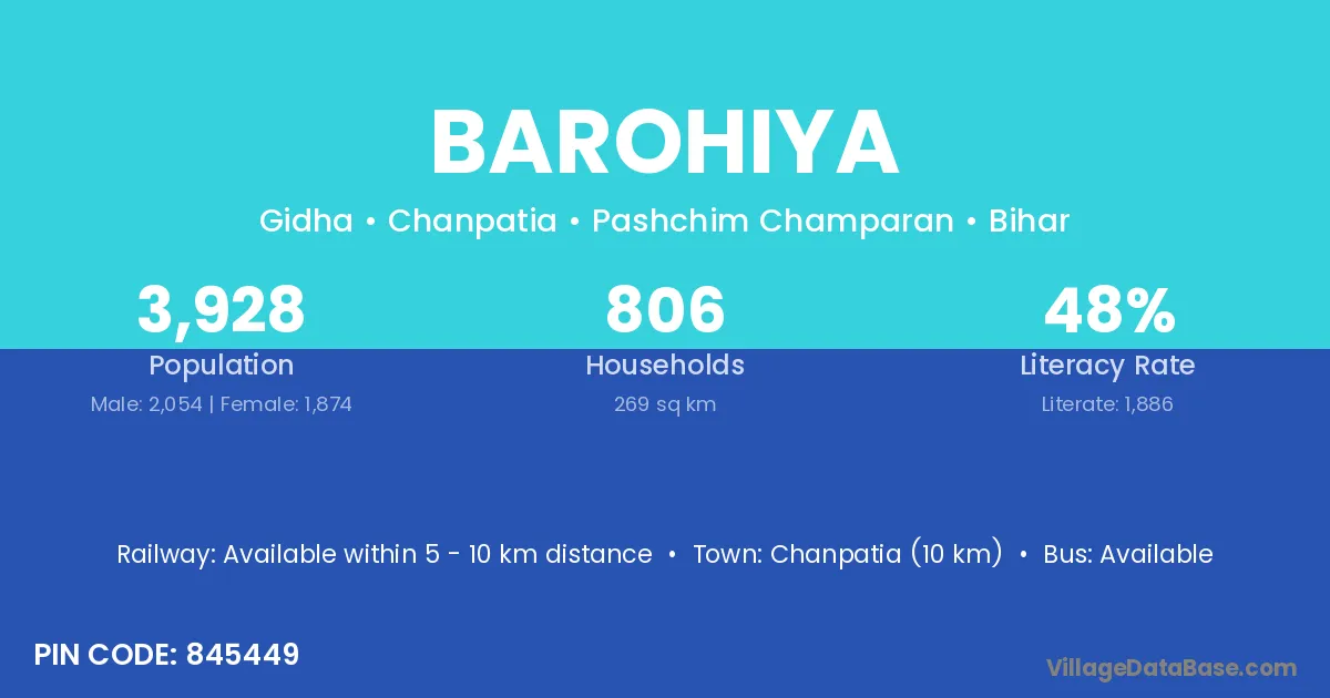 Chanpatia (10 km) is the nearest town to Barohiya village for major economic activities and is located approximately 10 km away.