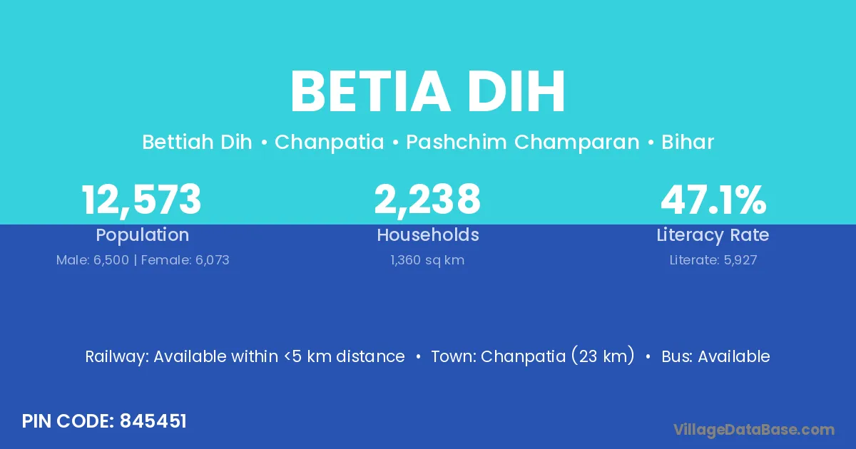 Chanpatia (23 km) is the nearest town to Betia Dih village for major economic activities and is located approximately 23 km away.
