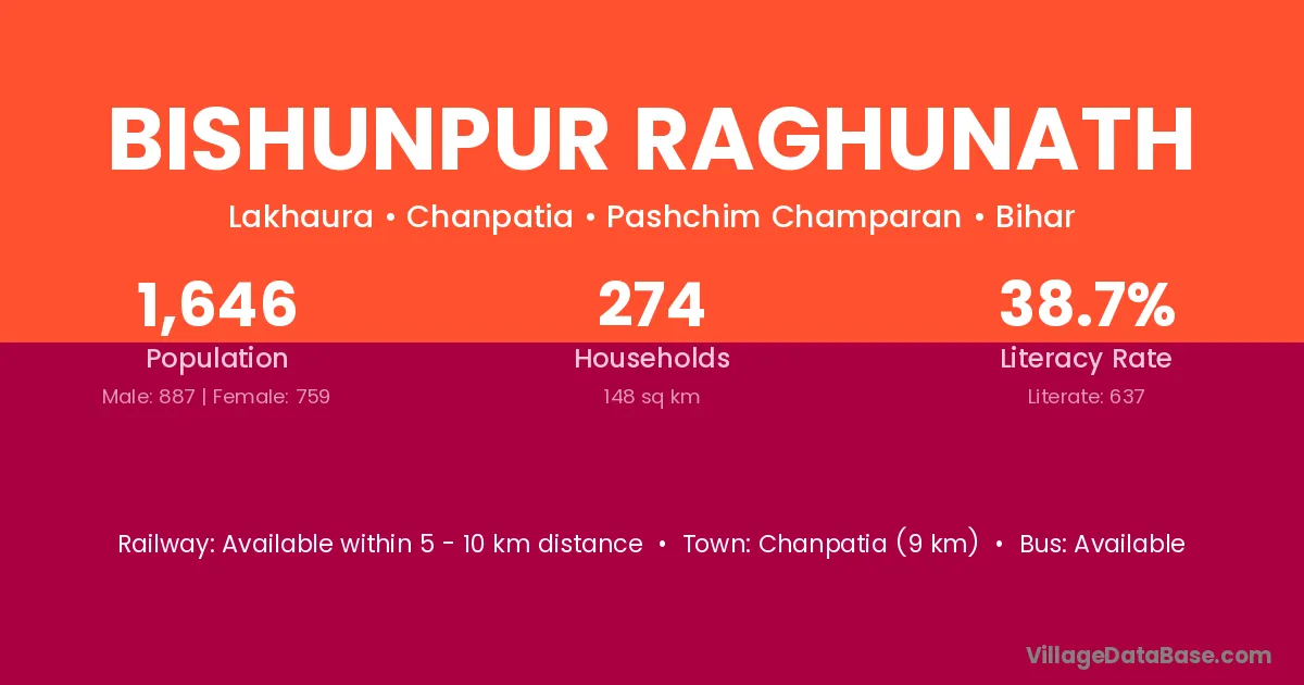 Chanpatia (9 km) is the nearest town to Bishunpur Raghunath village for major economic activities and is located approximately 9 km away.