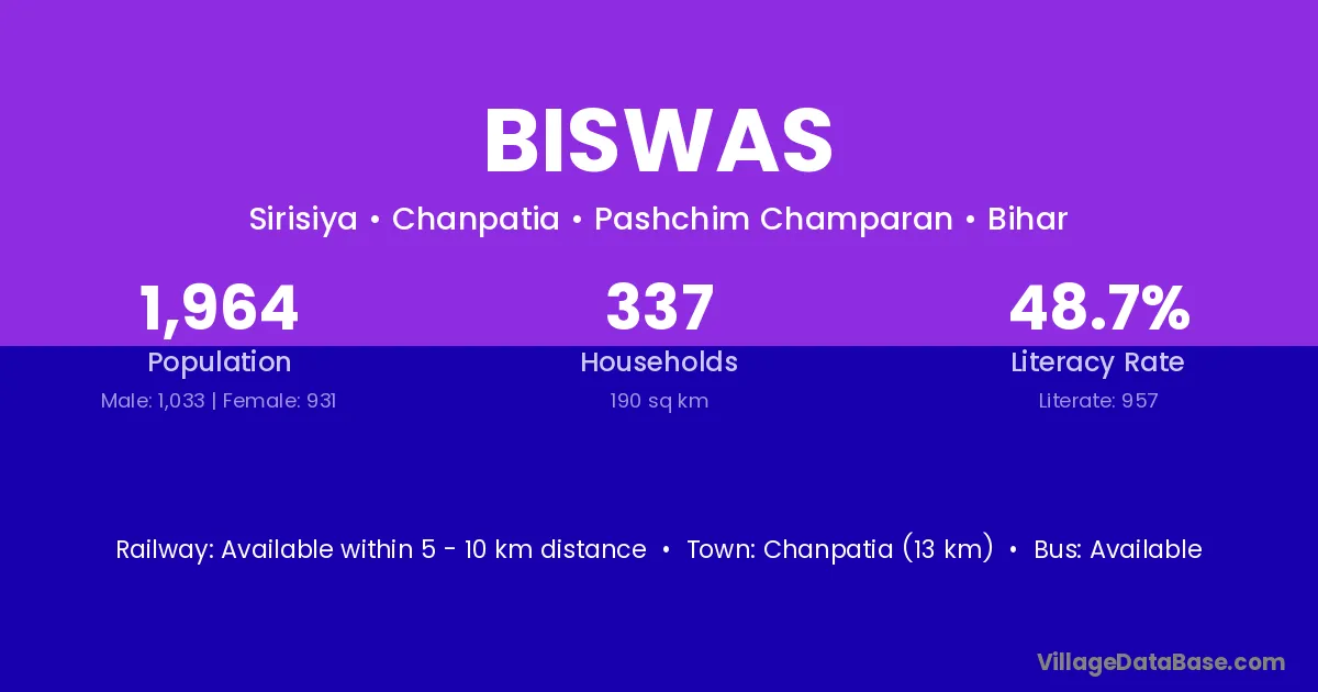 Chanpatia (13 km) is the nearest town to Biswas village for major economic activities and is located approximately 13 km away.