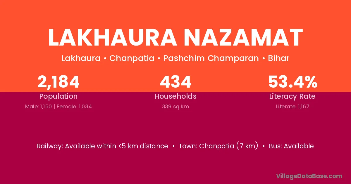 Chanpatia (7 km) is the nearest town to Lakhaura Nazamat village for major economic activities and is located approximately 7 km away.