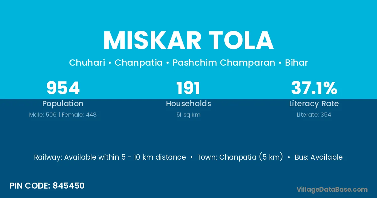 Chanpatia (5 km) is the nearest town to Miskar Tola village for major economic activities and is located approximately 5 km away.