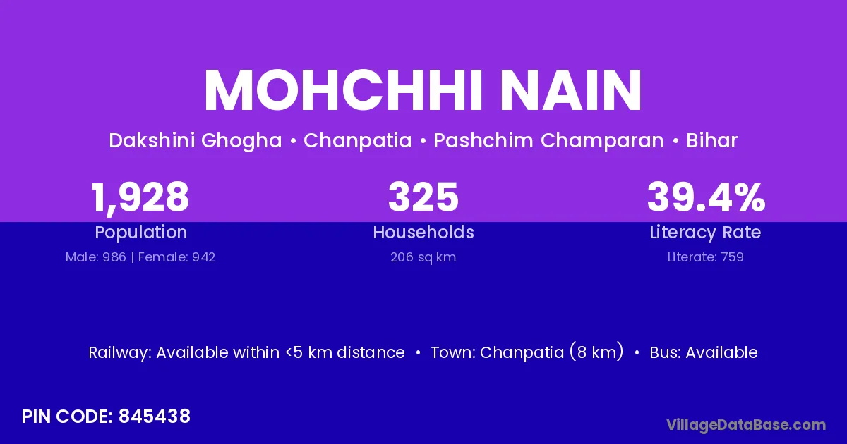 Chanpatia (8 km) is the nearest town to Mohchhi Nain village for major economic activities and is located approximately 8 km away.