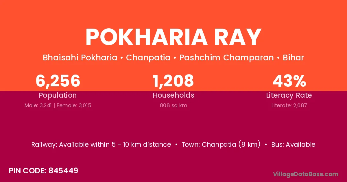 Chanpatia (8 km) is the nearest town to Pokharia Ray village for major economic activities and is located approximately 8 km away.