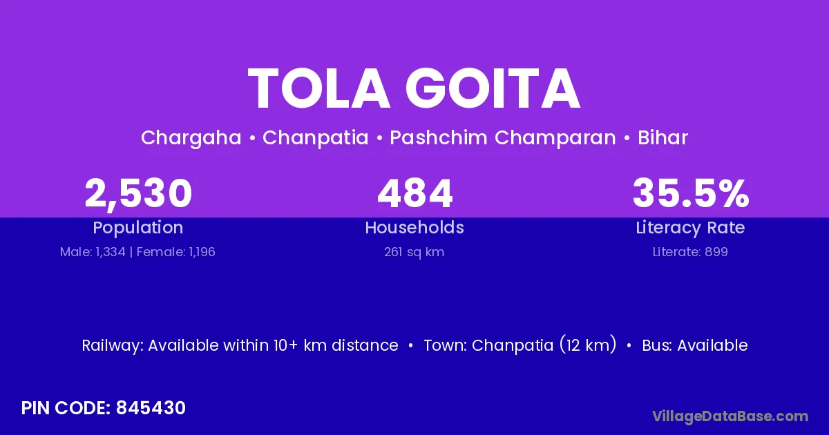 Chanpatia (12 km) is the nearest town to Tola Goita village for major economic activities and is located approximately 12 km away.